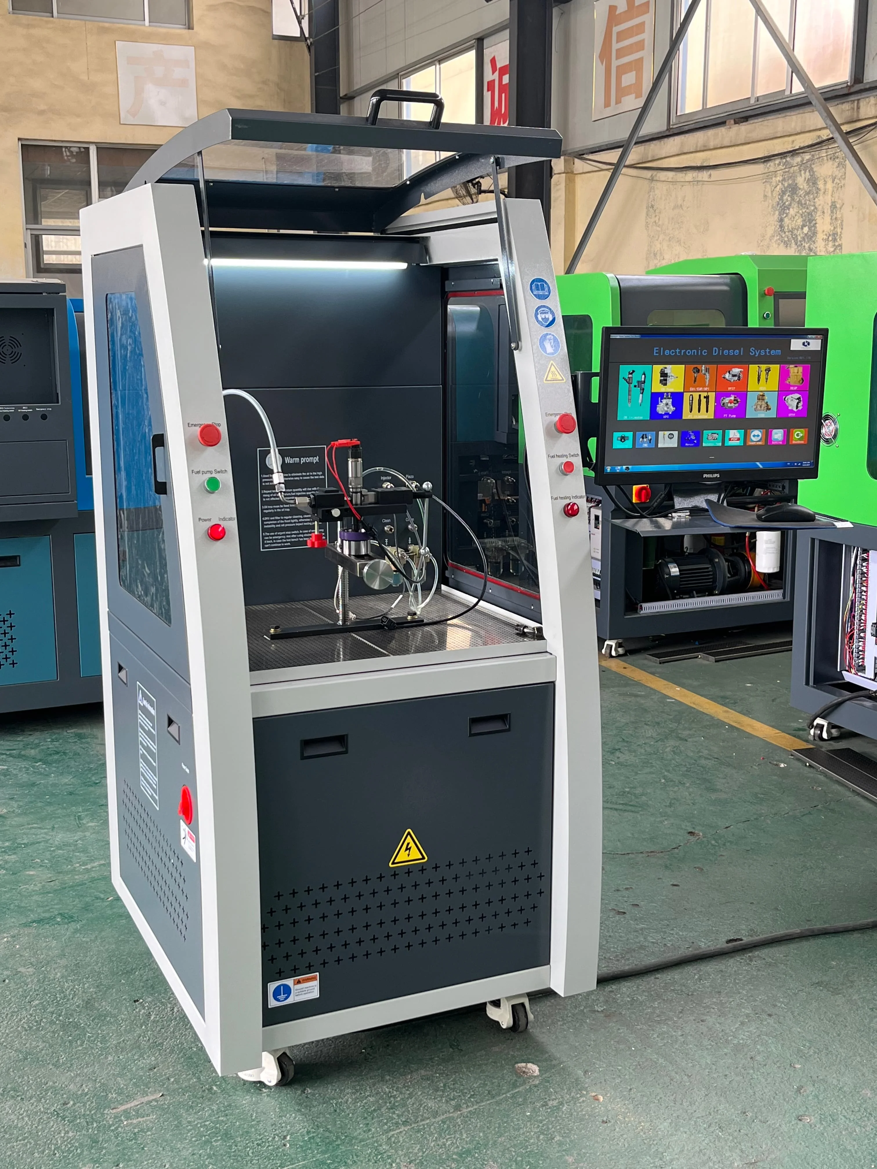 Professional test bench designed for CAT9000 series HEUI, EUI, and EUP fuel injectors, ensuring accurate performance testing and calibration for diesel engine components.