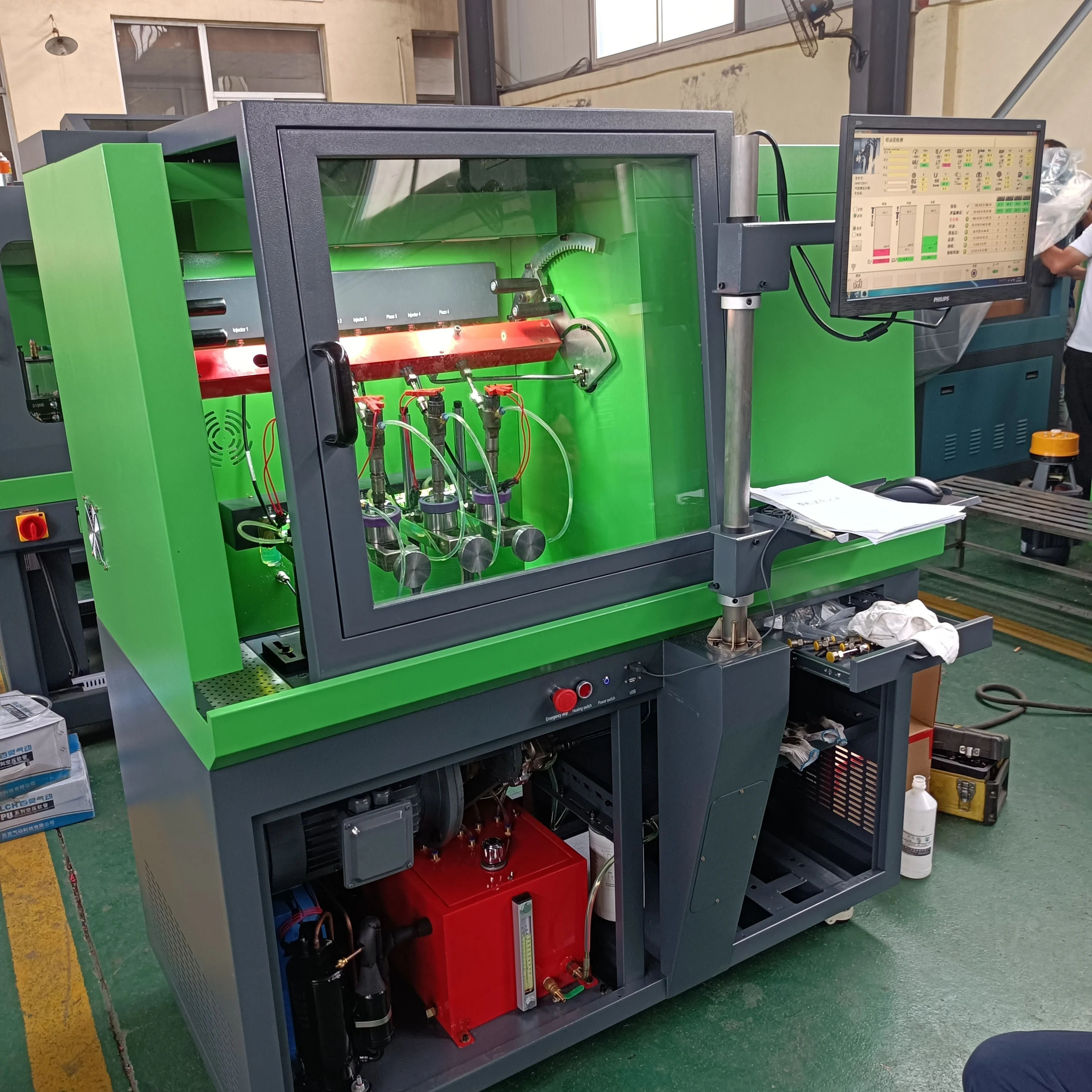 Professional test bench for CRI, CRP, EUI, EUP, HEUI, HEUP diesel fuel injection components, ensuring accurate performance testing and maintenance support for engine parts.